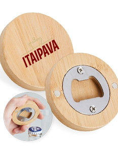 Abridor de garrafa em metal com acabamento em bambu e imã.