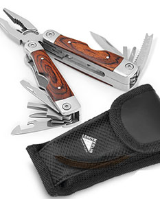 Alicate dobrável com ferramentas multifunções em aço inox e madeira, com 20 funções. Fornecido em bolsa em poliéster