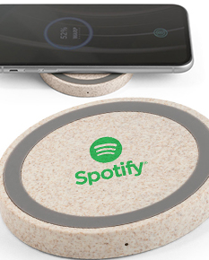 Carregador wireless em ABS e fibra de palha de trigo. A potência de carregamento é de 5W, com entrada 5V/2A. A base contém um círculo em silicone para o equipamento não se mova enquanto carrega. Incluso cabo micro USB de 1 m
