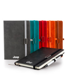 Bloco de anotações emborrachado com suporte para caneta. Contém aproximadamente 96 folhas amarelas sem pauta, suporte de nylon para caneta (não acompanha), marcador de página em cetim e elástico para lacre com plaquinha de centro emborrachado.