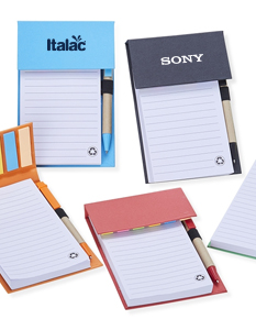 Bloco de anotações ecológico com caneta, feito em kraft com 6 blocos autoadesivos coloridos com aproximadamente 20 folhas e bloco com aproximadamente 100 folhas brancas com pauta. Possui porta caneta elástico e acompanha caneta de papelão e detalhes plásticos, carga esferográfica azul 1.0mm e acionamento por clique.