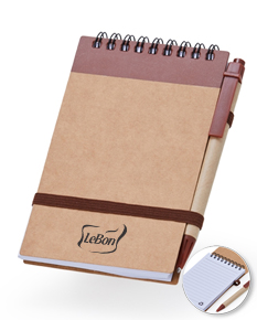 Bloco de anotações ecológico com caneta, feito em kraft com detalhe plástico. Contém aproximadamente 70 folhas brancas com pauta, porta caneta elástico, elástico para lacre e acompanha caneta de papelão com detalhes plásticos, carga esferográfica azul 1.0mm e acionamento por clique.