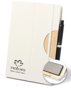 Bloco de anotações com tampa de função de suporte para smartphone. Produzido com caixa de leite, possui guarnições em bambu, porta canetas e elástico branco com 80 folhas(g/m2)pautadas na cor bege.