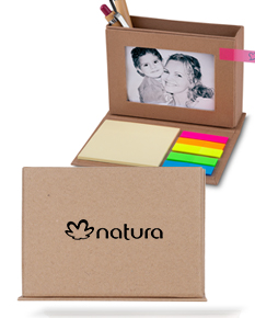 Bloco de anotações em papelão reciclado, contendo: 5 Sticky notes coloridos com 25 folhas; Bloco autocolante amarelo com 25 folhas; Porta canetas; Porta Retrato.