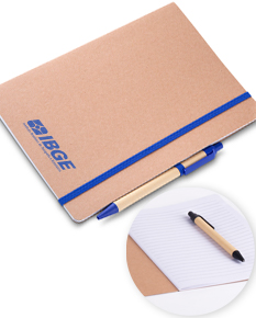 Bloco de anotações 21,5x14cm, capa em papel kraft com elástico, suporte para caneta e miolo com 30 folhas. 1 Caneta corpo em papel reciclado com detalhe em plástico.