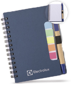 Bloco de anotações com autoadesivos e caneta de papelão. Possui capa dura revestida em papel especial, cinco blocos autoadesivos com 20 folhas cada e um bloco com aproximadamente 72 folhas brancas pautadas. Conta com suporte de nylon para a caneta e acompanha caneta de papelão com detalhes em plástico, carga esferográfica na cor azul e acionamento por clique.