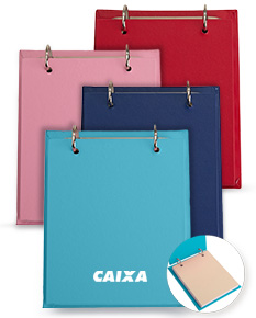 Bloco de anotações de mesa com trilho de ferro e capa dura em percalux. Possui aproximadamente 150 folhas brancas sem pauta com área destacável.
