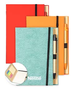 Um bloco de anotações com capa revestida em papel especial e fita elástica para fechamento. Contém aproximadamente 80 folhas amareladas destacáveis com pauta, além de um bloco com cerca de 20 folhas autoadesivas amarelas e aproximadamente 100 marcadores de página autoadesivos, divididos em cinco cores diferentes. Acompanha uma caneta esferográfica com carga azul de 1.0mm e acionamento por clique, corpo em papelão e demais componentes em plástico.
