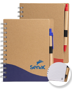 Bloco de anotações ecológico com caneta, capa produzida em papelão com detalhe texturizado e verso liso. Contém miolo com aproximadamente 70 folhas pautadas, suporte de nylon e acompanha caneta de papelão com clip e ponteira de plástico, carga esferográfica 1.0mm e acionamento por clique.