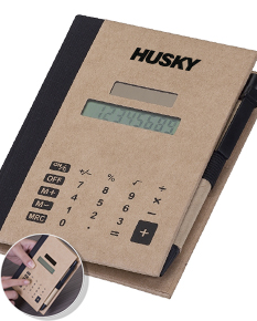 Bloco de anotações ecológico com capa calculadora solar de 8 dígitos acoplada. Possui quatro blocos autoadesivos com aproximadamente 25 folhas cada, bloco verde com aproximadamente 25 folhas, bloco branco de rascunho com aproximadamente 30 folhas sem pauta e suporte elástico com caneta ecológica de papelão com clip e ponteira plástica preto.