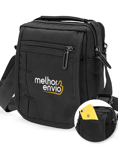 Bolsa de ombro confeccionada em nylon impermeável com alça ajustável para ombros e outra para mão. incluindo um bolso antifurto, um localizado na aba frontal, ambos com fechamento em zíper, e outro na parte interna da aba.