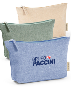 Bolsa em 70% algodão reciclado e 30% poliéster reciclado (140 g/m²). Interior com forro 100% algodão. 250 x 140 x 60 mm