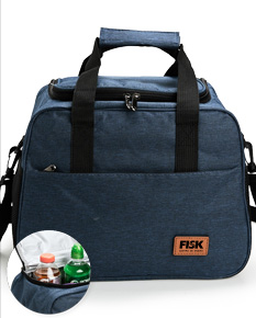 Bolsa térmica confeccionada em Oxford com fechamento em zíper e capacidade de até 20 litros. O compartimento interno possui revestimento térmico em PEVA. Conta com compartimento frontal de zíper, um par de bolsos laterais em tela de tecido respirável com elástico. Apresenta ainda duas alças de mão com suporte de juntura e alça transversal regulável e removível, com mosquetões para encaixe nas fivelas laterais. Acompanha plaquinha em couro sintético fixada com velcro.