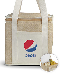 Bolsa térmica em juta sintética com bolso em algodão, combinando estilo natural e praticidade. Possui interior costurado com revestimento em PEVA branco, alternativa ecológica ao PVC, que auxilia na conservação térmica. Conta com alça de mão, fechamento em zíper e capacidade de até 5 litros, sendo um brinde corporativo funcional e sustentável.