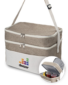 Bolsa térmica em Juta sintética e bolso em algodão. Interior costurado revestido em PEVA (Polietileno vinil acetato, alternativa ecológica ao PVC), alça de ombro ajustável e capacidade de até 14L. Possui dois compartimentos térmicos com sistema de fechamento por meio de zíper.