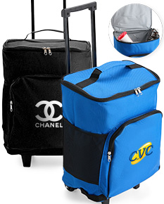 Bolsa térmica confeccionada em poliéster resistente à água e capacidade máxima de 30 litros. Possui compartimento interno com revestimento em PEVA atóxico antivazamento. Dispõe de quatro rodinhas, alça metálica com puxador em plástico, além de freios removíveis com encaixe firme em velcro. Conta ainda com bolso frontal com zíper e dois laterais em tela de nylon.