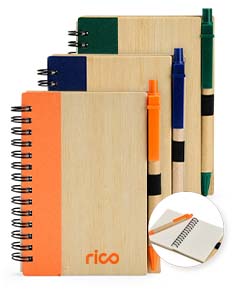 Caderno com capa de casca de bambu e faixa colorida, encadernação Wire-O e cerca de 70 folhas pautadas amareladas. Acompanha caneta esferográfica azul (0,8 mm), com corpo de papelão, clip, ponteira plástica e acionamento por clique. Elástico na capa para fixar a caneta.