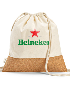 Sacola tipo mochila em 70% algodão reciclado e 30% poliéster reciclado (180 g/m²) com base em cortiça. Alças em algodão. 370 x 410 mm