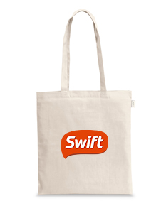 Sacola confeccionada em 100% algodão reciclado (140 g/m²), com alças de 65 cm. Medidas: 380 x 420 mm. Ideal para quem busca um produto sustentável e resistente para uso diário.