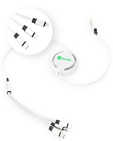 Cabo USB retrátil 3 em 1 com extensão máxima de 1m. Possui conectores USB-C, Micro USB e Lightning em uma extremidade e conector USB-A na outra. Observação: cabo destinado apenas à recarga; não realiza transferência de dados.