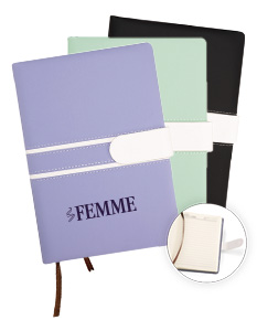 Caderneta com capa em couro sintético de acabamento aveludado, fecho magnético e marcador de páginas em fita de cetim. Possui cerca de 96 folhas marfim com pautas e espaço para assinalar dias da semana e datas numéricas.