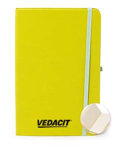 Caderno de anotações, capa em fibra de açucar e tecido RPET com suporte para caneta, miolo com 80 folhas pautadas na cor bege.