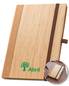 Caderno A5 de capa dura em folha de bambu e cortiça. Contém 80 folhas, em papel reciclado, pautadas cor de marfim, fita separadora, suporte para esferográfica (não inclusa) e elástico para fecho do caderno. A cor e o resultado da impressão nos materiais naturais pode variar entre produtos. 140 x 210 mm