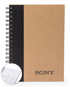 Caderno com capa kraft e espiral metálico. Possui aproximadamente 85 folhas brancas pautadas e folhas destinadas aos dados pessoais, calendário de 2024 à 2026, planejamento e contatos.