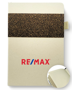 Caderno de anotações, capa em fibra de açucar e tecido RPET com suporte para caneta, miolo com 80 folhas pautadas na cor bege.