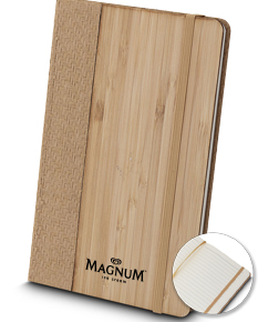 Caderno de anotações com capa em fibra de bambu, que oferece um toque natural e elegante. Possui elástico para fechamento e 80 folhas pautadas na cor bege, ideal para anotações diárias.