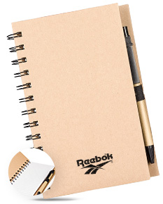 Um caderno de capa dura em papelão com porta-canetas elástico, encadernação Wire-O e dois bolsos interiores. Contém aproximadamente 70 folhas brancas com pauta além de um bloco com cerca de 20 folhas amarelas autoadesivas. Inclui também seis blocos de marcadores de página coloridos autoadesivos com cerca de 20 unidades cada. Acompanha uma caneta esferográfica com carga azul de 1.0mm com acionamento por clique, corpo em papelão e demais componentes feitos em plástico.