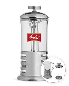 Cafeteira tipo prensa francesa com capacidade de até 350ml, ideal para preparar café com praticidade e sabor intenso. Produzida em vidro, possui alça e detalhes em inox, além de tampa com êmbolo e filtro em tela de inox. Um item elegante e funcional, perfeito para brindes corporativos sofisticados.