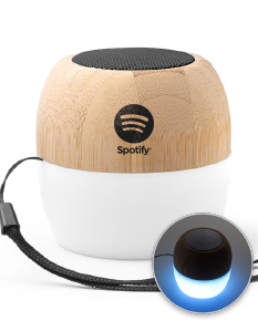 Caixa de som em bambu com pega em PP. Contém 3 diferentes luzes LED e transmissão sem fios BT v5.0 para se conectar ao seu dispositivo móvel. Possui uma potência de 3W, capacidade até 300 mAh e autonomia aproximada de 2 horas.