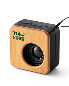 Caixa de som portátil em ABS reciclado e bambu. Com potência de 3W e transmissão por bluetooth 5.0 e função de rádio. Tempo de reprodução até 4h com uma bateria de 500 mAh.