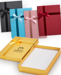 Caixa para presente em papelão com acabamento levemente texturizado e laço decorativo de cetim colado na tampa. Conta ainda com berço removível em espuma com ranhuras.