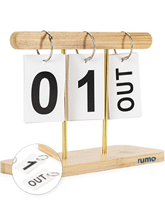 Calendário permanente de mesa com estrutura feita em madeira e duas hastes de sustentação em ferro. Conta com fichas de papel cartão presas por argolas de ferro, que permitem organizar os dias em números e os meses em versões abreviadas.