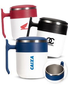 Caneca com design modero, feita em inox e capacidade de até 350ml. Ela possui revestimento externo, alça e tampa de encaixe em plástico, além da base emborrachada antiderrapante para oferecer mais segurança durante seu uso.