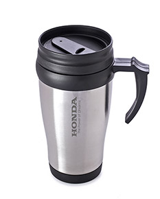 Caneca de inox com detalhes plásticos, capacidade de 400ml. Tampa com vedação e bocal com trava de segurança.