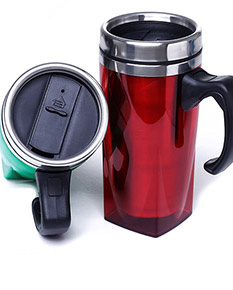 Caneca 450ml com tampa e compartimento interno de inox. Não é térmica.
