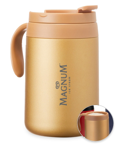 Caneca térmica feita em inox 304 com parede dupla, capacidade de 500ml. Contém tampa com acesso para o bocal, alça plástica e base antiderrapante