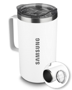 Caneca térmica em aço inox com parede dupla isolada à vácuo, tampa plástica e anel em silicone para vedação, alça lateral. Capacidade 750ml.