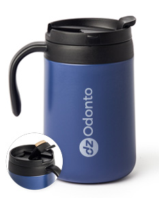 Caneca térmica feita em inox 304 com parede dupla, capacidade de 500ml. Contém tampa com acesso para o bocal, alça plástica e base antiderrapante.
