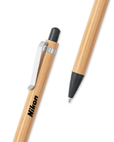 Esferográfica em bambu e ABS com acabamento metálico mate. Possui mecanismo twist e clipe em metal. Escrita a azul