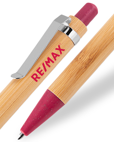 Esferográfica em bambu e ABS com acabamento metálico mate. Possui mecanismo twist e clipe em metal. Escrita a azul