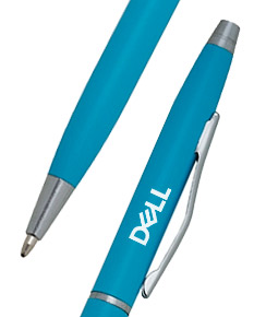 Caneta metal com pintura fosca colorida e detalhes em prata. Clip metálico, acionamento por giro e carga esferográfica azul.