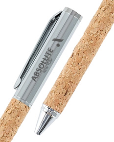 Caneta metálica com detalhe em cortiça, carga esferográfica azul 1.0mm e acionamento por rotação.