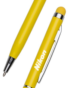 Caneta metal fina com ponteira touch. Corpo colorido com clip e anel central prata, possui borracha touch na cor da caneta. Aciona por giro.