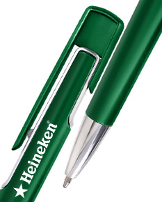 Caneta esferográfica plástica, com pintura metalizada e com acionamento por clique.