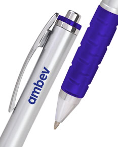 Caneta plástica com detalhe emborrachado para maior conforto, tinta esferográfica azul e acionamento prático por clique.