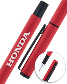 Caneta metálica com touch screen, carga esferográfica azul e acionamento por rotação.